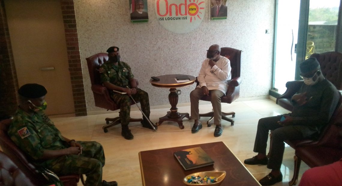 Gomina Akeredolu soro atileyin yin lasiko to n gbalejo oga agba tuntun ti won sese gbe wa Brigadier General Raymond Utasaba lofisi re.