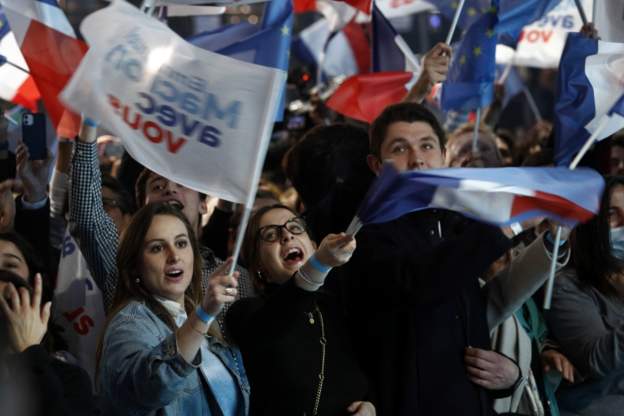 Huge cheers erupted at the election night HQ of Emmanuel Macron.