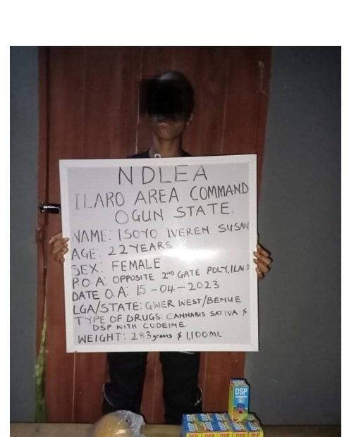 A 22-year-old HND 1 female student of Federal Polytechnic, Ilaro, Ogun state, Isoyo Iveren Susan was on Saturday, 15th April, 2023, arrested for dealing in illicit drugs.