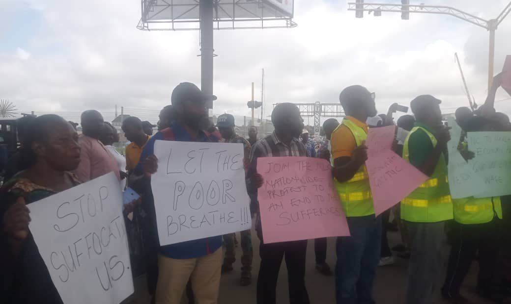 The protesters carried placards with inscriptions “Tinubu stop suffocating us”, “Let the poor breath”, “Join the NLC to end suffering” among others.