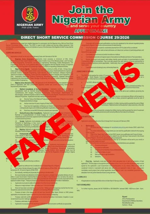 The Nigerian Army has issued a warning over a fraudulent recruitment advertisement circulating on social media and other online platforms, which claims that the Direct Short Service Course (DSSC) 29 Application Form 2026 is available.
