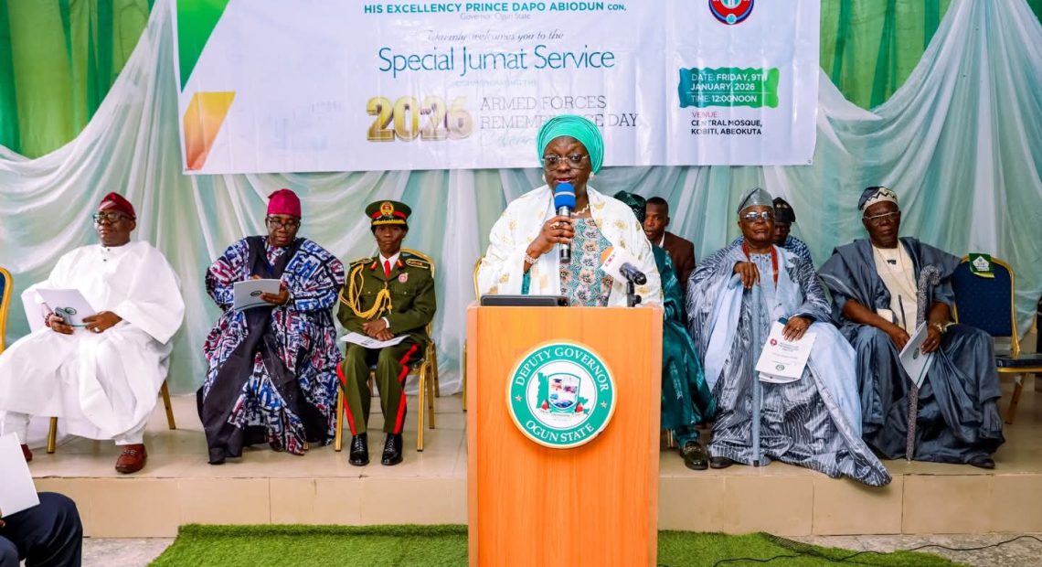 Represented by the Deputy Governor, Mrs Noimot Salako-Oyedele, Governor Abiodun delivered the charge at a Special Jumat Service held at the Central Mosque, Kobiti, Abeokuta, to commemorate the 2026 Armed Forces and Remembrance Day.