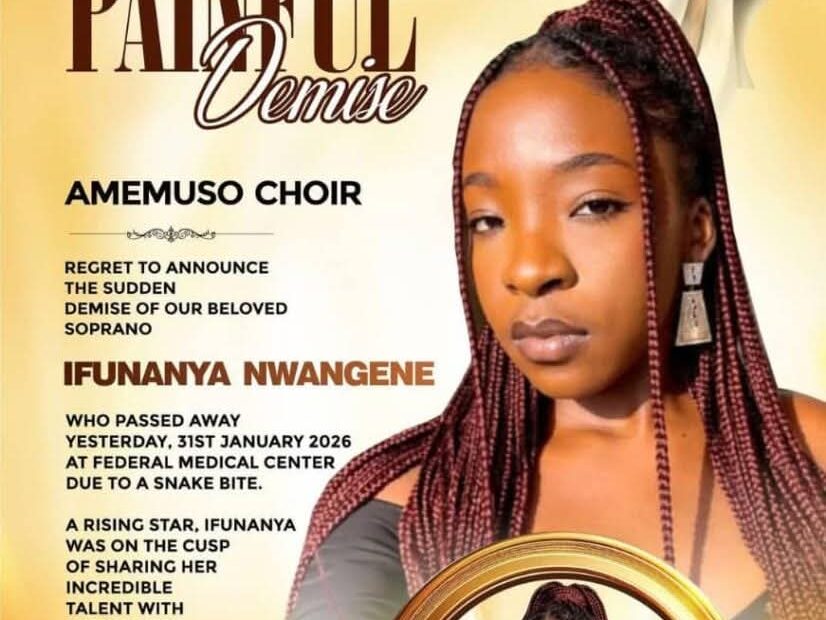 “We regret to announce the sudden demise of our beloved soprano, Ifunanya Nwangene, who passed away yesterday, 31st January 2026, at the Federal Medical Centre due to a snake bite,” the statement partly read.