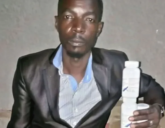 Mike Elvis Tusubira looking directly at the camera, wearing a black suit jacket and striped blue shirt. In his left hand he is holding some white plastic medication containers.